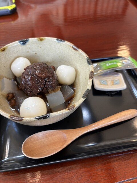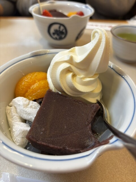 期間限定の紅白ぞうにをいただきました。桜味の紅いお餅と白いお餅の上にふわふわの卵がのっていて、量もちょうど良かったです。デザートのクリームあんみつも食べることができました。