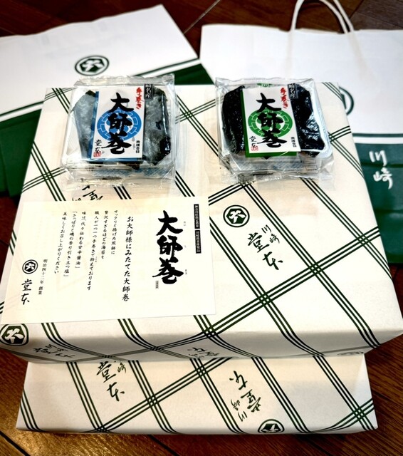 以前、頂きもので初めて食べたことがキッカケで「大師巻」のことを知りました。その時は「すぐに売り切れる川崎大師のお煎餅」程度の認識でしたが、あまりの美味しさに驚いた記憶があります♪名物に美味いものなし、と思っていたので良い意味で完全に裏切られました♪