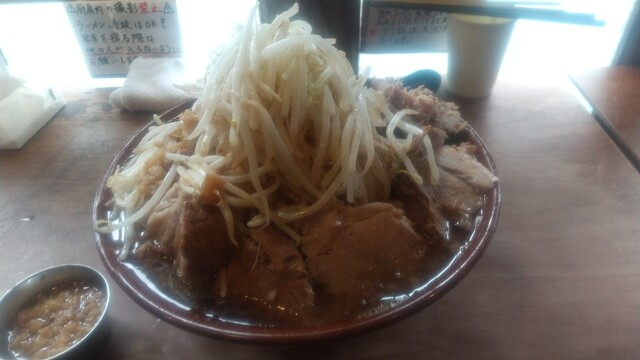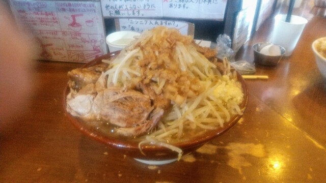 先週に引き続き訪問。定番のラーメン600gに今日は、豚増し×2セットを注文。券売機でラーメン券1,000円、・豚増し券×2枚600円・麺増しは生玉子50円×3枚で代用し購入、割箸、レンゲ、水を用意し着席、配膳までの間に持参した割箸よりちょっと長めの箸(500g以上になると器がすり鉢状になってて深く、割箸では天地返しがちょっとやり辛いため)を用意し、少し待ってからお決まりの「ニンニク入れますか?」のコールに「ニンニク有り、油増し野菜マシマシ」を返答。すぐに配膳され「行ってらっしゃい」コールがあり、携帯のカメラでカシャッとしてから、20分完食のお決まりのためストップウォッチモードに切り替えスタート、そこからはいつものようにがむしゃらに食べて行き、20分以内で難なく完食。いつもながら麺もスープも豚もむちゃくちゃ旨かった\(^o^)/配膳時「いってらっしゃい」退店時「お元気で」のコールも他店では絶対聞けないね!!。ごちそうさまでした。来週は、天理店で野菜マシマシ1kgの爆盛を食す予定です。