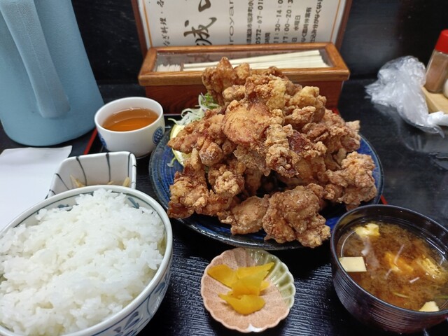 アラ還ジジイのデカ盛り唐揚げ食べ歩き 岐阜県瑞浪市「城山」を初訪問。こちらのお店は、唐揚げ以外のメニューもデカ盛りらしく、結構な人気店との事で、開店11:30の1時間前に到着。駐車場に車を停めると、店の前には既にお二人さんが待っておられた。そこから待つこと15分程して中へ通してくれた。中で待たせて貰えるかと思いきや、すぐに注文を聞きにきた。営業時間までまだ40分以上もあるのにと思いつつ、唐揚げ定食大・ご飯大盛りを注文。大の上に特大があり、唐揚げだけで1.5kgあるらしいのだが、初訪問という事で、今日はとりあえず大を注文。しばらく待って配膳。唐揚げの多さにびっくり(@_@;)味付けもしっかりしていてどちらかというと濃い方だ。旨い、外はカリカリ、中はジューシー。20分程で完食。ごちそう様でした。リピ確定!!次は特大に挑戦予定。
