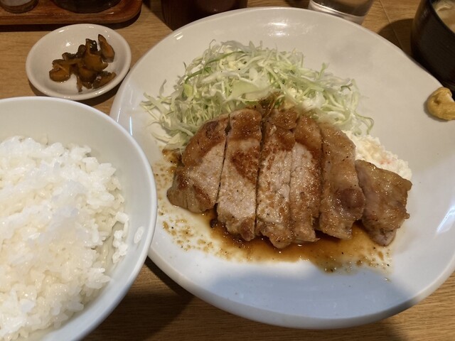 メンチカツが有名らしいですが、なんだか生姜焼きの気分だったので生姜焼き定食を注文。18時頃に来店したため運良くすぐ席に座れました。豚の脂身の旨み甘みが美味しく、普通の生姜焼きに比べるとボリューミーでたっぷりと美味しくいただきました。切り盛りされている店長さんは、とても気さくな優しい方で、美味しさ以外にもこの店が愛される理由があるんだと思いました。次回はメンチカツを食べに来ます!