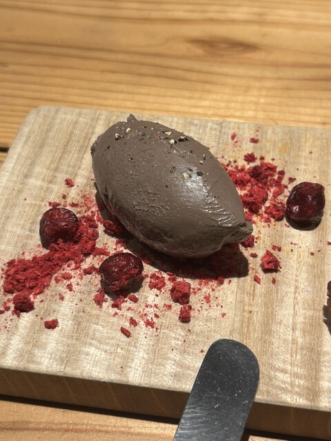 濃厚チョコとレバーの風味、苦みが混ざり合って複雑な美味しさ。ドライクランベリーの酸味がとてもあっていて、これだけでずっとワインを飲み続けられる美味しさ