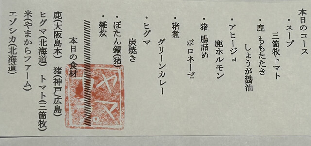コースは三箇牧(高槻)のトマトのスープからはじまり、ジビエは大阪島本の鹿や、神戸の猪、北海道のヒグマにエゾシカと盛だくさん。これらジビエのお肉はどれも臭みがなく、軟らかくて食べやすい。気に入った料理は「猪のグリーンカレー」と「ぼたん鍋」ですが、ほかのどのお皿も美味しかったです