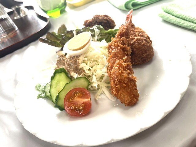 まずは揚げ物の盛り合わせが着弾。唐揚げ、エビフライ、クリームコロッケ!