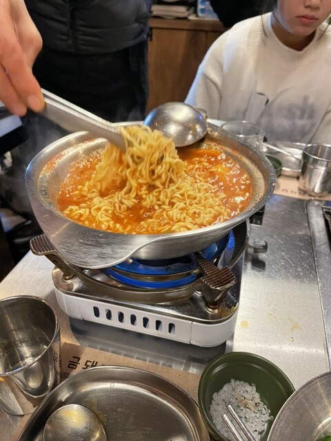 チゲ?は、キムチがとても酸っぱかったんですが私は好きでした。チゲの後はラーメンを入れて食べます。激辛ですがおいしいです。また渡韓した際は行きたいお店です♪