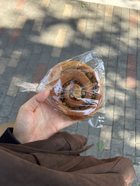 店内のショーケースの中のパンはどれもすごく魅力的でめちゃくちゃ迷いましたが今回はシナモンロールを!胡桃が入ってるシナモンロールにしました。外カリッ、中モチっとしていて絶品でした。゚(゚ ◜ᴗ◝゚)゚。ここのパン屋さんは食パンが人気みたいなのでまた食パン買いに行きます!