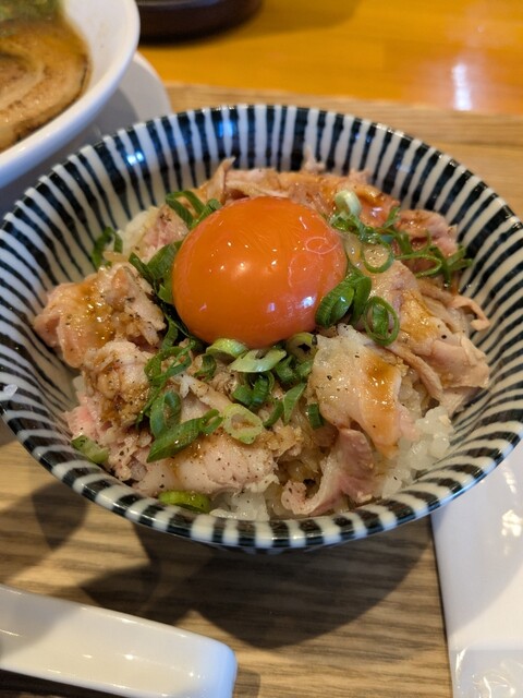 "炙りレアチャーシュー丼"。黄身が濃厚。