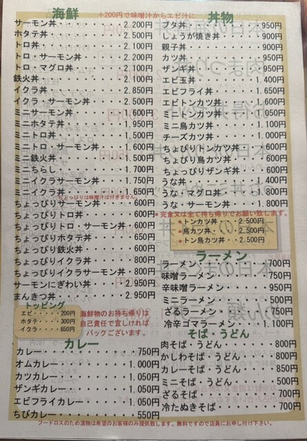 メニューが多く、写真付きではないのでイメージがつかない。本日の海鮮丼1750円と、お得丼セット3000円、ミニトロサーモン1600円、ミニカレー550円を注文して、運ばれてきてビックリ。インパクト大。