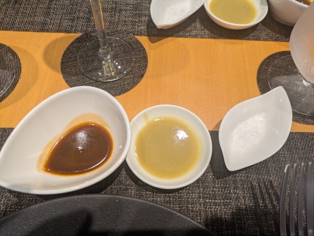 メインのローストビーフも①醤油ベースソース②わさびソース③岩塩と3種類の提供があって全て味あわせて頂きましたが、どれも美味しかったです。