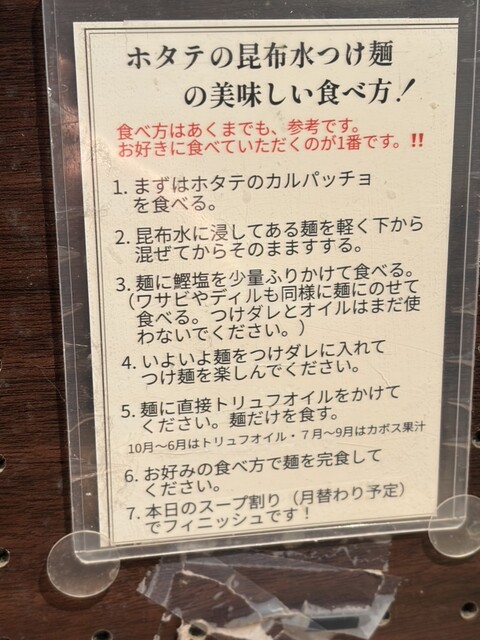 ほたて日和という名前の通り、帆立をメインとした昆布水つけ麺が人気のお店です。
