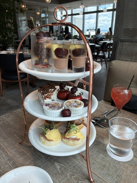アメリカンチェリーのアフタヌーンティーをいただきました。大きな粒のアメリカンチェリーがたくさん乗っており大満足でした。デザート系はもちろんのこと、最下段に乗っていた小さなハンバーガーも絶品でした。ドリンクも飲み放題でとても良かったです。