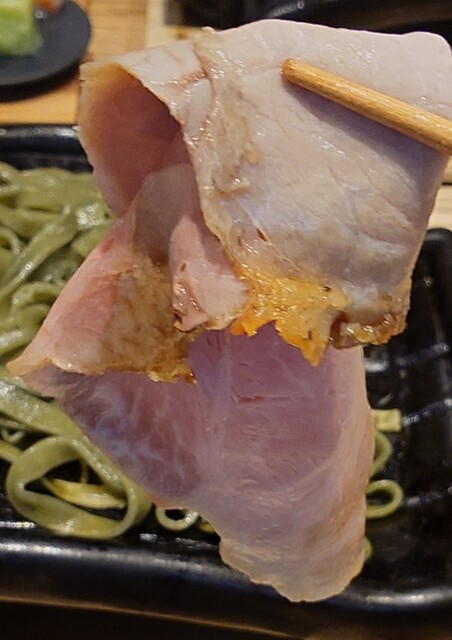 鴨南蛮はつけ汁が鴨汁、併せ岩中豚焼はもうどんの上に豚肉が乗っていますが、この豚が大きくて柔らかで焼加減も抜群、じゅわーっと旨味が広がります。