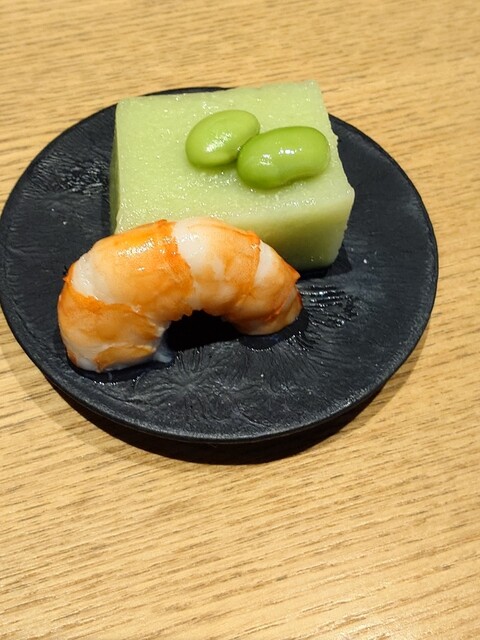 八寸がまたお洒落。今日は薩摩芋の白和え、鶏の八幡巻き、枝豆豆腐、芽キャベツの飛子乗せ、稲荷寿司等(説明してくれたのですが覚えきれず、違っていたらごめんなさい)。自家製の胡瓜のわさび漬けが絶品。枝豆豆腐はぷるっぷるで葛餅みたいです。玉子焼きもいつも口にするものとは別もの、正に割烹の味です。
