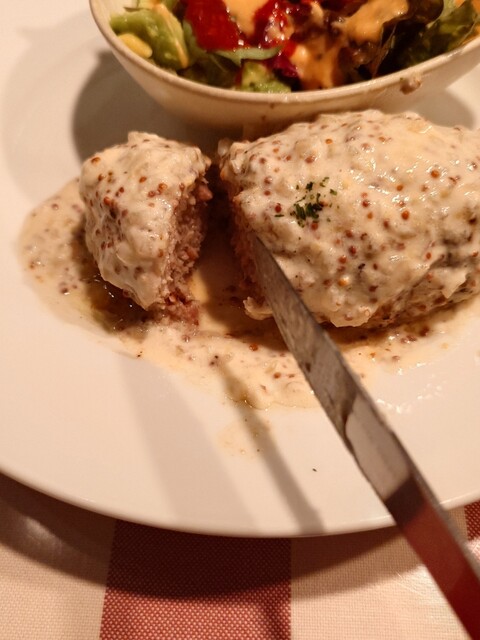 ハンバーグはピンク&ブラックペッパー、ソースはヨーグルトマスタードを選びましたが、この組合せは正直言って失敗。香辛料が複雑に絡みすぎて肉の味が隠れてしまいました。3種チーズにデミグラスソースの組み合わせが美味しかったようです。