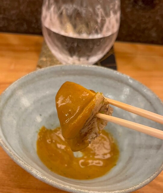 珍しい奈良漬とワサビが添えられている。ちょっとこれはあん肝にはあわないと思ったがあん肝にマッチするよう作られていて舌触りがめちゃくちゃクリーミーであん肝だけどあん肝じゃない感じ