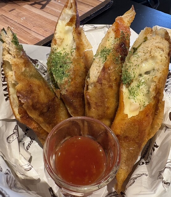 マグロとチーズがめっちゃあう素敵なハーモニーのサクサク春巻き。こちらはエスニックな雰囲気でチリソースをつけて。