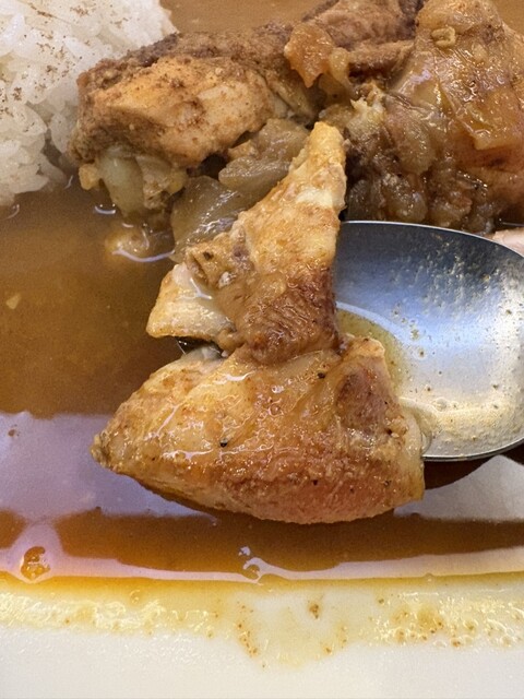 まんまるのご飯にさらっさらのスープのようなカレー、手羽元が3本、