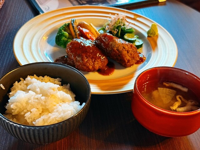 おすすめされた定食メニュー、ご飯と味噌汁付きです。手ごねの丸いハンバーグが2個、火入れがとても難しいので、これをおすすめしているだけで感心してしまいます。もちろんしっかり火は通って、美味しく仕上がっていました。デミグラスソースとわさびの組み合わせは斬新。