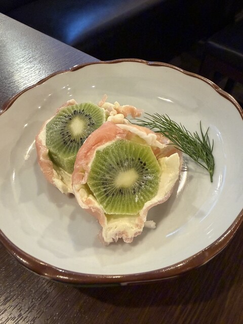 生ハムの塩味とキウイの甘味、クリームチーズの濃厚さが相まりとても美味しい。