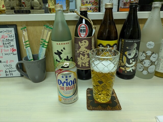 アルコールは様々な黒糖焼酎、古酒、泡盛、オリオンビールなど楽しめる