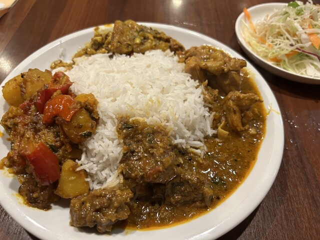 夜の8時に来店、テ-ブルが1席空いていて運良く待たずに食べられました。お目当てのマトンビリヤニの代わりにチキンティッカセットのマトンカレ-の激辛にしました。てか、最近いつも激辛ばかり頼んでるんで、辛さは麻痺してるかもしれません。カレーはスパイスが効いていてこの店ならではの美味しいカレーで、マトンがゴロゴロ入っていて柔らかく、そして汗がじわっと、この感じがたまりません。チキンティッカも柔らかくボリュームがありスパイスが効いています。激辛とと言うほど辛くはないので、お勧めです。難波へ来たら、また食べに来ようと思わせる奥深いインドカレーです。