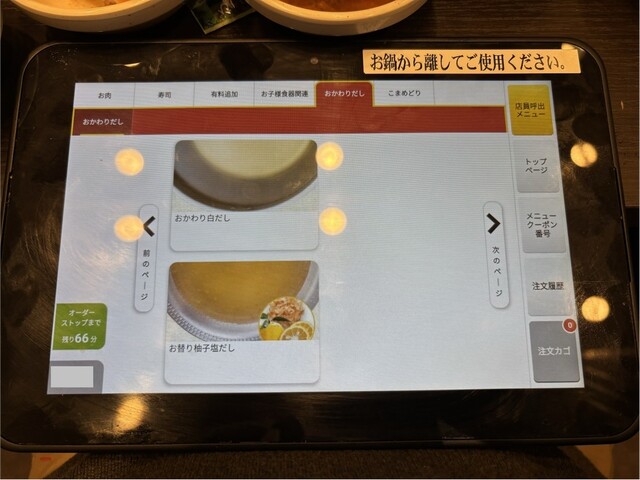 肉・寿司は、タブレットより注文 スープは、店員さんが入れてくれる