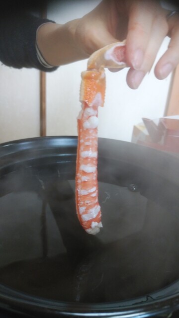 テーブルには、カニ、カニ味噌、お刺身、お鍋の野菜が並び、