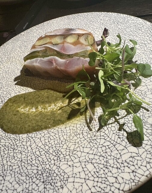 鯵と焼きネギ南高梅のテリーヌと本日の鮮魚のカルパッチョをオーダー。鯵と焼きネギ南高梅のテリーヌは綺麗です。梅は本当に魚介の旨さを引き出します。南高梅最強です。