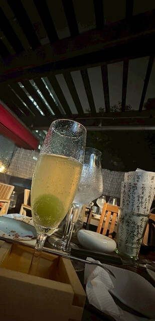 ドリンクも魅せます。シャインマスカットと洋梨のこぼれスパークリングワイン。枡にグラスが乗ってます。店員さんが注いでくれます。わざと溢れさせる演出に「えェ〜あァ〜ぴぇ〜」とか言って騒ぎます。グラスの底にはシャインマスカットが一粒。