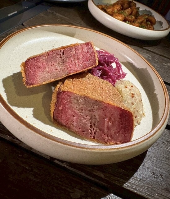 先ず口コミで1番気になってた真っ黒な“イカクリームコロッケ”。割と大きめです。外側は固く、ナイフで「ガッツ」と切ります。中はイカの切身が入ったイカ墨濃厚クリームでした。見た目怖そうだけど仲良くなるといい奴、そんな食べ物です。コクがあって美味でした。