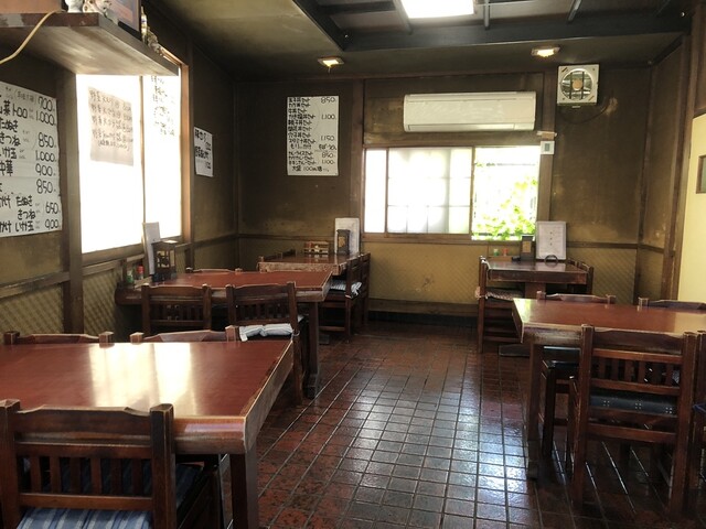 入口を入ると正面にレジと厨房があり、左側にテーブル席が並ぶ客席がありました。