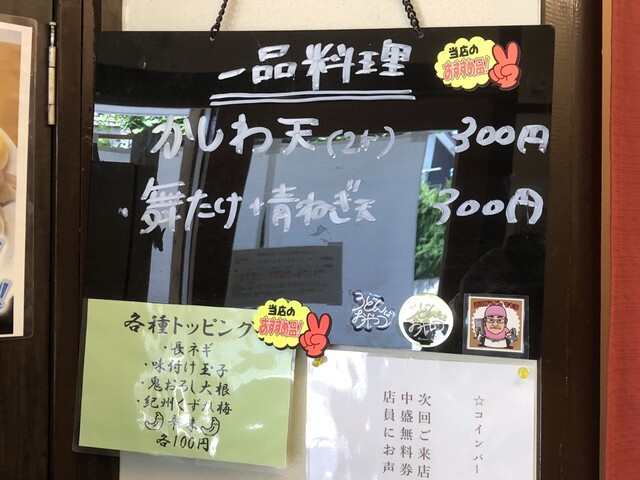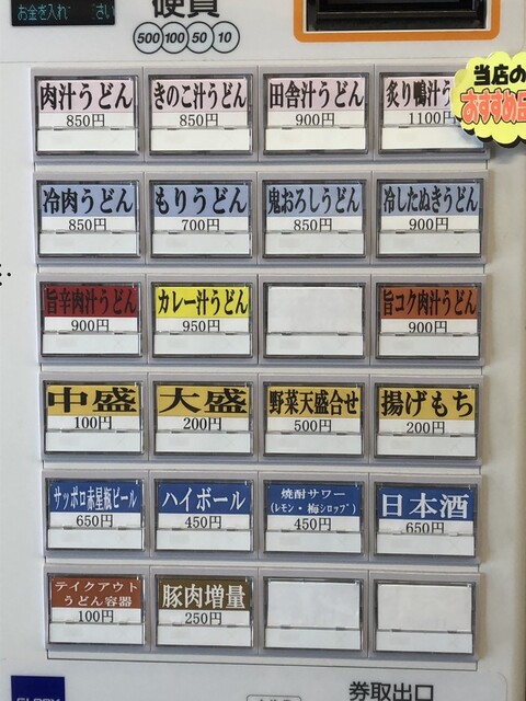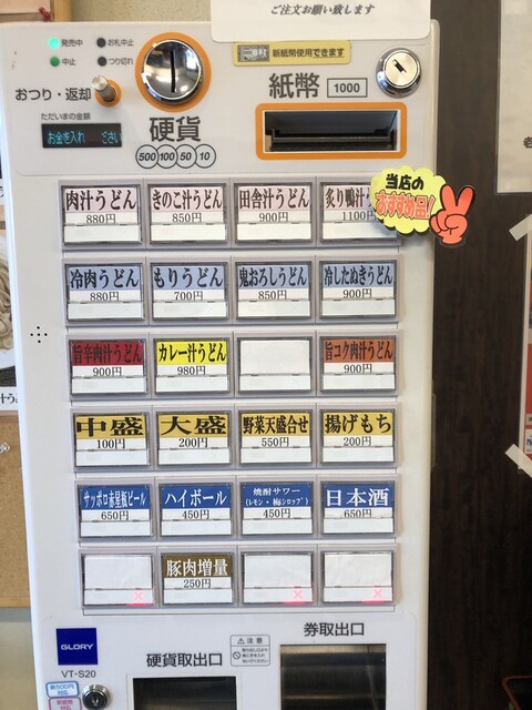 券売機で旨辛肉汁うどん900円➕大盛200円の食券を買い、着席してからかしわ天300円を現金で注文。うどんの辛さは2辛をチョイス。