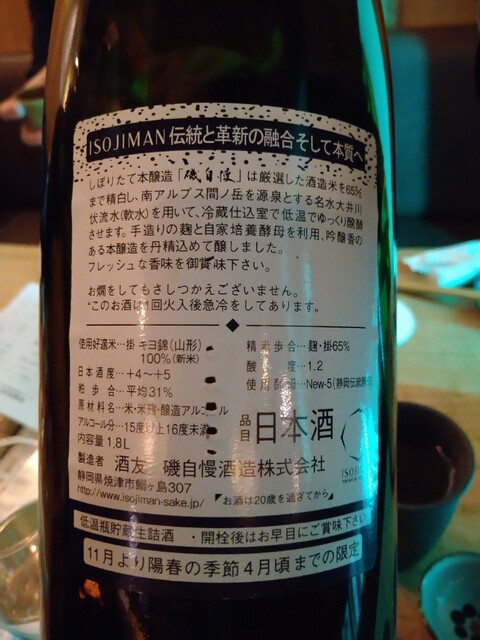 磯自慢本醸造:宗玄の後に飲んでしまったため、かなり線の細い、あっさりさらさらな味わいに感じられてしまいました。飲みの序盤に、海のものと合わせてじっくり飲むときっと違った印象になったことでしょう。次回に期待します。
