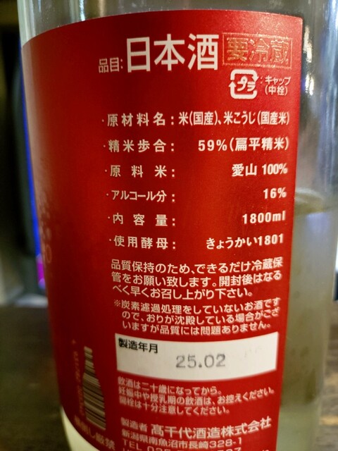 たかちよ。飲食店限定片仮名タカチヨを所望したものの品切れのようで、ひらがな。900円。上質なお酒な味がします。甘さはありつつ、いつものたかちよよりすっきりな印象です。