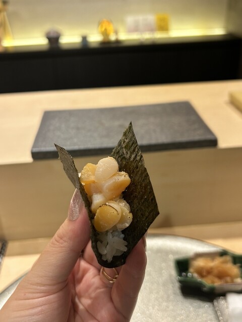 小柱のにぎり たっぷり入って、手渡しで ノリの香りが良い