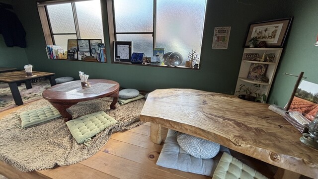稲武のどんぐりの湯の近くで、木のぬくもりがある店舗です。