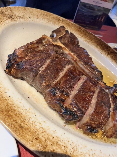 骨付きのTボンステーキ。サイズが驚くほど大きくてお肉自体が柔らかく食べやすいのにお肉のソースとしてほうれん草のクリームとじゃがいものソース。そしてトマトベースのソースこの3種類を食べ比べしながら食べました!どのソースもお肉との相性が良くバランスのある味でパクパクいけちゃいました!