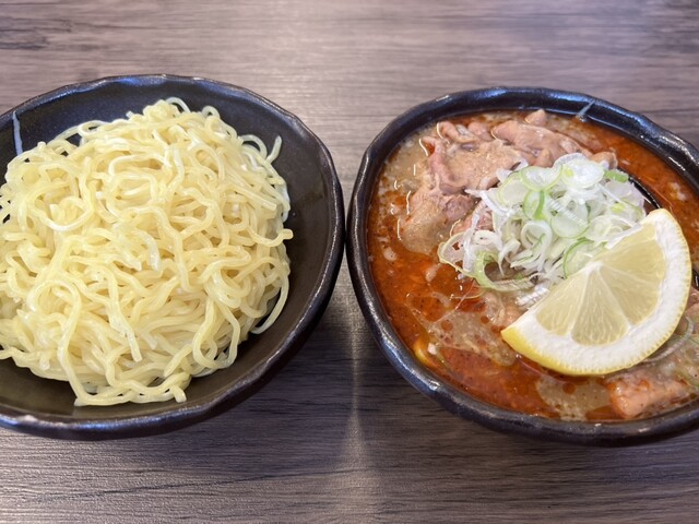 中華麺をつけて食べて、ちょっと辛さが足りなかったので卓上の一味唐辛子を麺にかけていただきました。