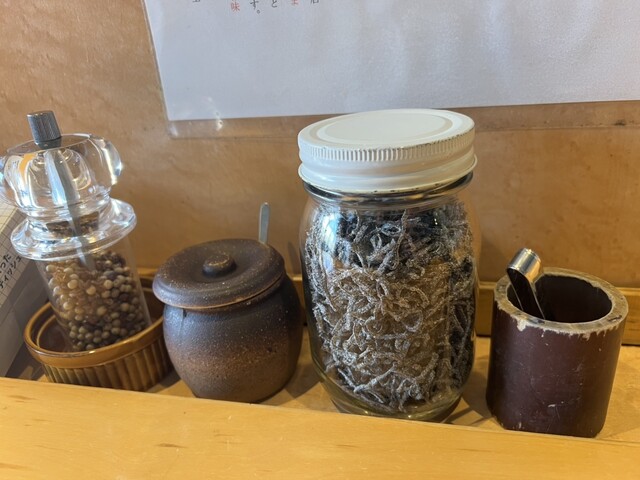 卓上調味料はミル引きの黒胡椒と花椒が入ったもの、特製ラー油、塩昆布という、ちょっと変わったラインナップです(^^)