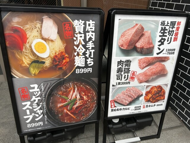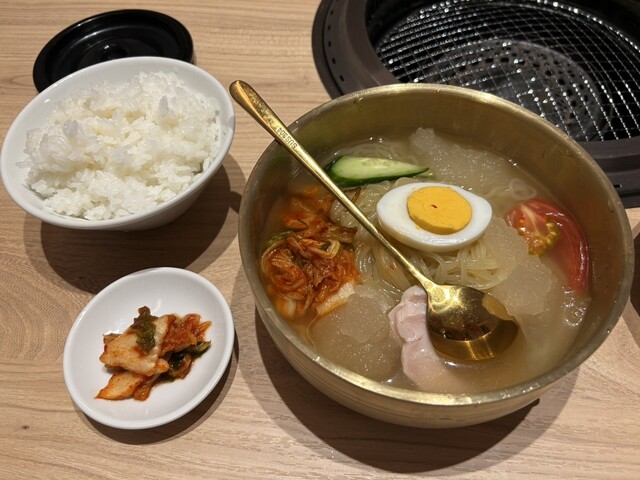 料理は、昼間だったのでランチメニューがありリーズナブルに食べられます。私は二人で行って冷麺ランチとレアステーキ丼、霜降り肉寿司、炙りトロユッケを食べました。キムチもそれぞれについています。冷麺も中にもキムチがあって、別でもついてます。全部美味しかったですが私の1番はレアステーキ丼。味、お肉の柔らかさ、食べやすさ最高でした。今まで食べてきたステーキ丼No.1かな。冷麺は氷が溶けて時間が経つほど味が染みて美味しく感じました。タンのメニューは半分以上すでに売り切れてたので早めに行かないと残ってないかも。また行きたいです。