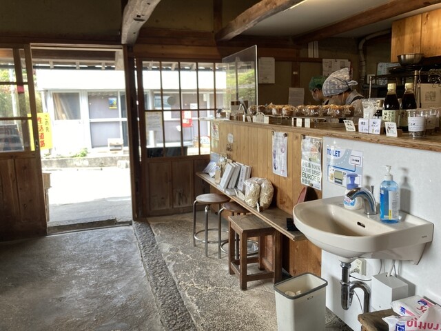 いちごミルクはツブツブの濃厚いちごジャムと牛乳を混ぜたような、とろっとしたテクスチャー。甘すぎず苺の粒感も酸味も優しく、飲みやすい。ハンバーガーは、中の野菜がレタスではなく水菜というのも里山の手作りバーガー感があり、ソースや牛肉はもちろん絶品。牛はジューシーでくどさがなく、バンズはパン屋さんの拘りのパン?と思うようなふっくらして香り豊かなもの。具はシンプルで、そこが山で食べる食事らしくて心から満足。
