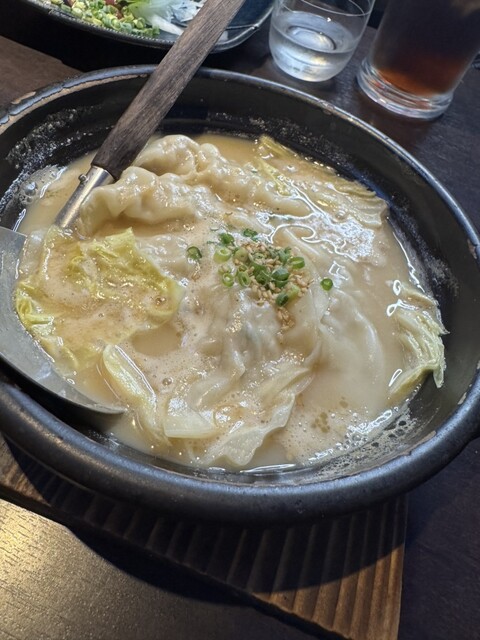 とんこつスープの中に具沢山のジャンボ餃子が入っていました。濃厚なとんこつスープは全部飲み干したくなる美味しさでした。