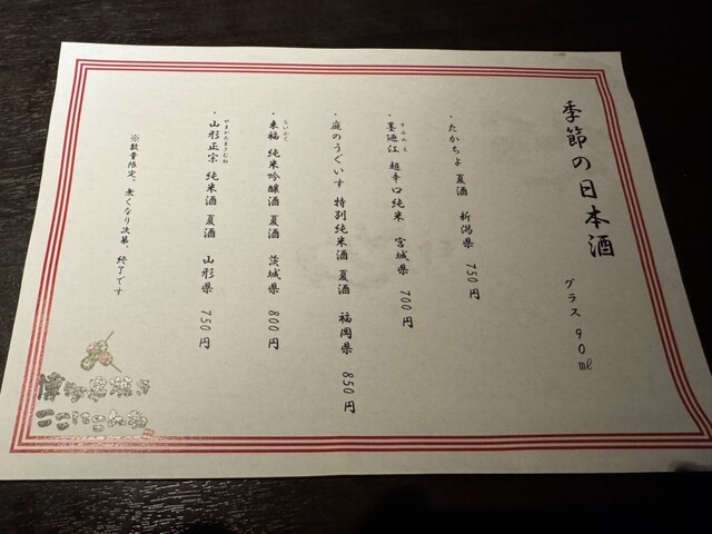 夏季限定の日本酒があり、私は宮城県産の「すみのえ 超辛口純米」を。友人は福岡県産の「特別純米酒 夏酒」を注文。他にも色々な日本酒があるので飲み比べも楽しそうです。