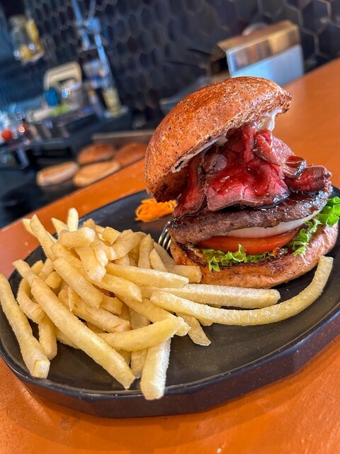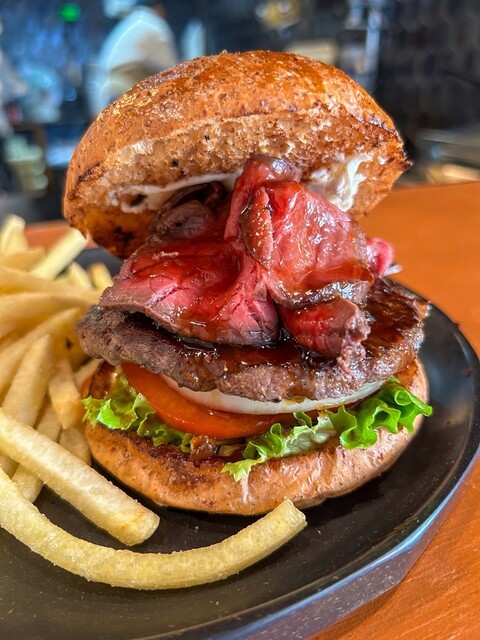 マンスリーからレギュラーメニュー化した人気バーガーで、鹿肉パティの上に鹿肉ローストをのせちゃったゴージャスなダブル鹿肉バーガーです。
