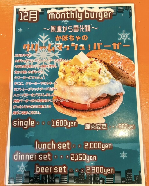 鹿肉パティに変更したんですが、鹿肉とかぼちゃスイーツを一緒に食べてるような、不思議な調和がありましたね。