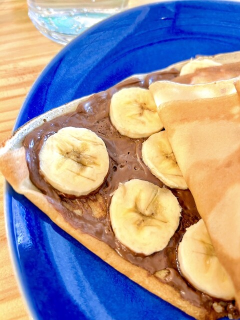 ヌテラがたっぷり塗られたもちもちのクレープにバナナが寝転んでいます。