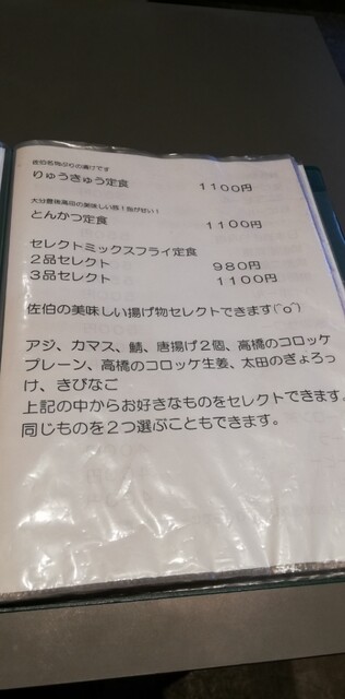 ミックスフライ定食をアジフライ・きびなごフライ・生姜コロッケで注文。
