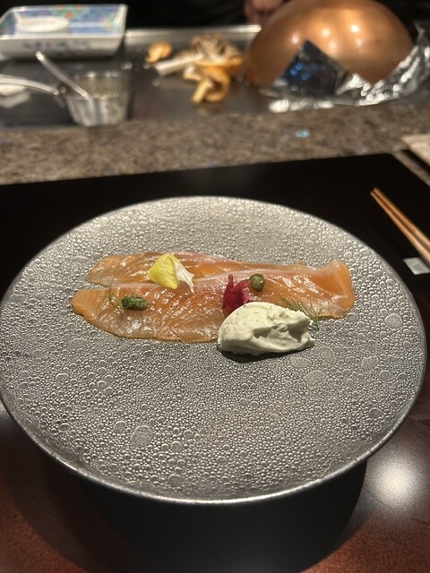 サラダでリフレッシュした後は、目の前で仕上げられた鮑。鉄板で焼かれた鮑は柔らかさの中に弾力もあり、海の香りがぎゅっと凝縮された逸品。さらに塩釜蒸しにした鮑は海苔のソースと合わせることで奥行きが増し、まるで海そのものを味わっているような感覚でした。