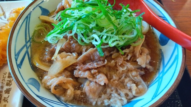 店内は常にお祭り騒ぎ。土曜日だしね。前回来た時は「釜揚げうどん」だった。他の人がいつも頼んでる「焼きたて肉ぶっかけうどん」が気になってたので、今日はそれだな。天ぷらは〜……かき揚げ、えび天、半熟卵に決定、稲荷も行っとくか?うーん、ちょっと無理かな?今回はこれで決めた!