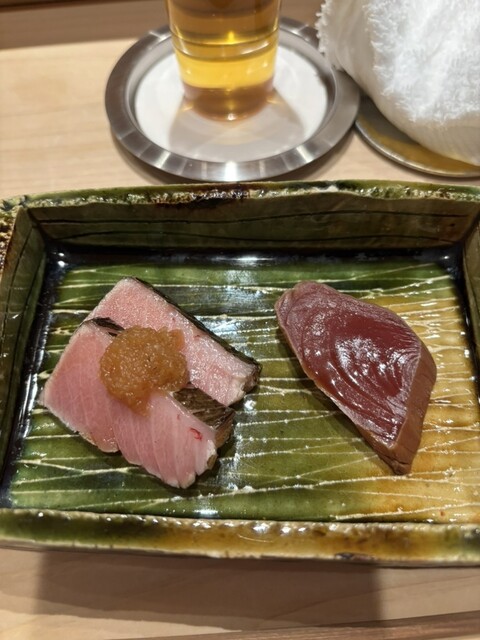 先にツマミが出て握りに移るという伝統的なスタイルを守っている。ツマミはスマガツオを目の前のグドで藁焼きにして叩きにするという演出からスタートして気分を上げて来る.ついで鰯の磯辺巻きと今年の当たり魚を外さないところに感心していると,佐島のタコの柔らか煮が湯気を立てて出てきた。タラの白子焼きも季節柄だし、アラの酒蒸しも出汁が多めで美味しく飲めた。蒸し鮑もマダカの黒鮑で、キモのソースは多めで,残してご飯を混ぜて食べる趣向も良い。ツマミは全7品で質も高いし仕事も良い上に、最初から山葵が小皿に用意されているのも、わさび好きには嬉しい配慮だろう。